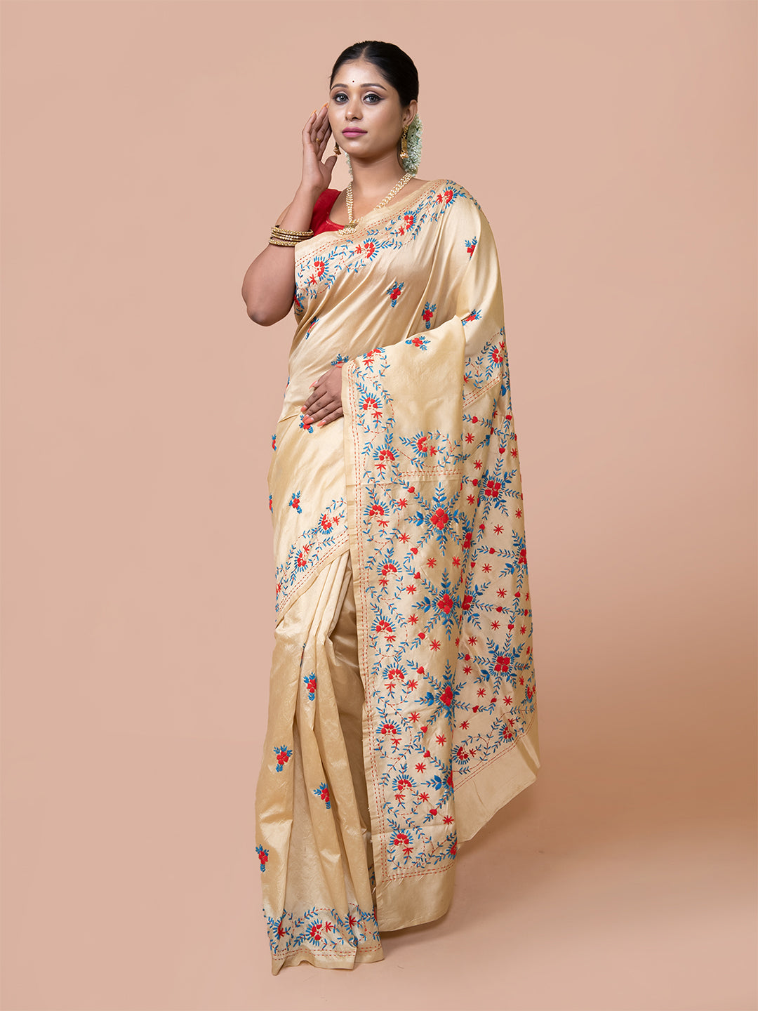 | Beige & Multi silk blend embroidered kantha work saree for women |