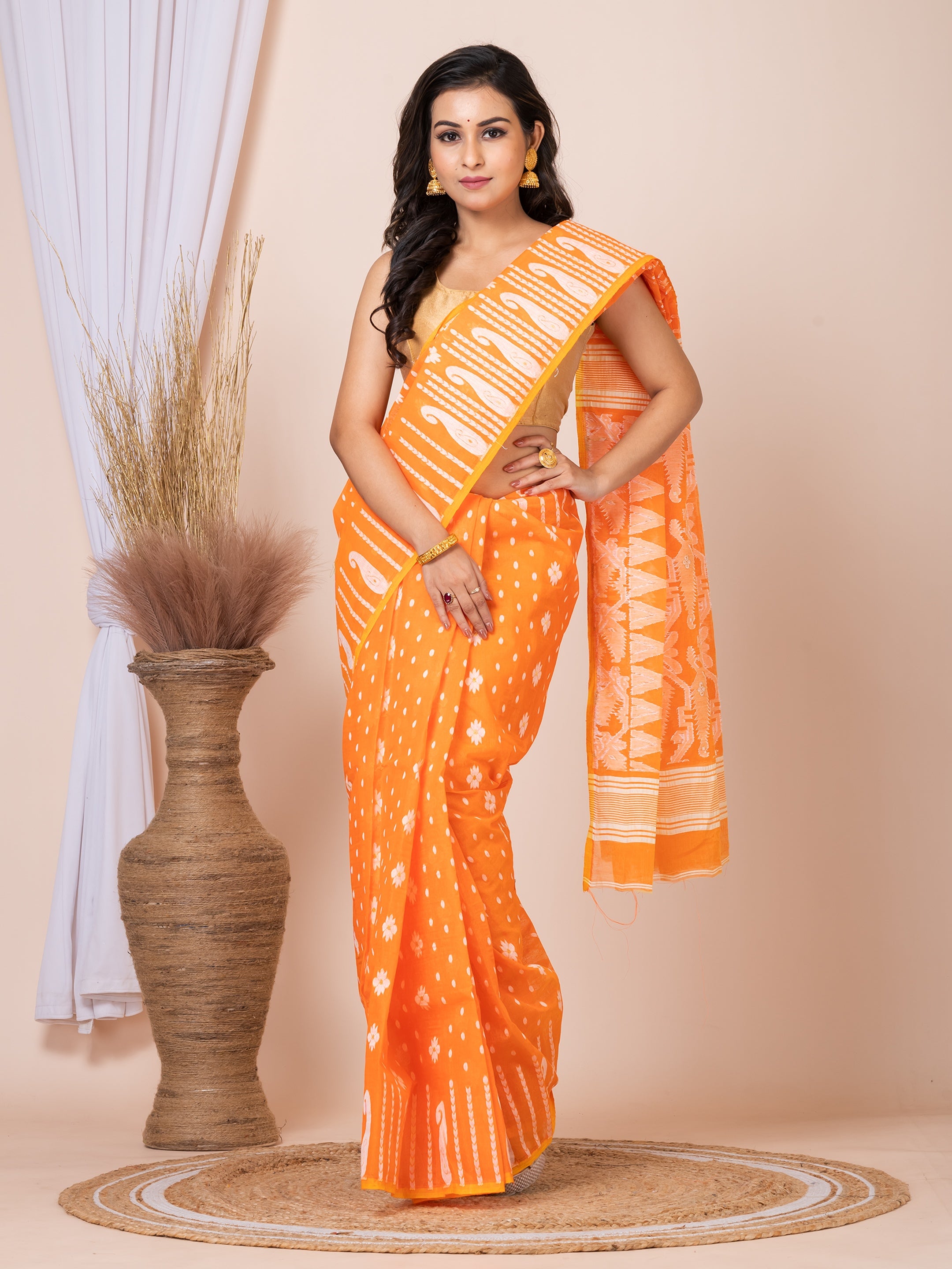 | Laa Calcutta Orange & White Women Woven floral design Pure cotton jamdani saree |
