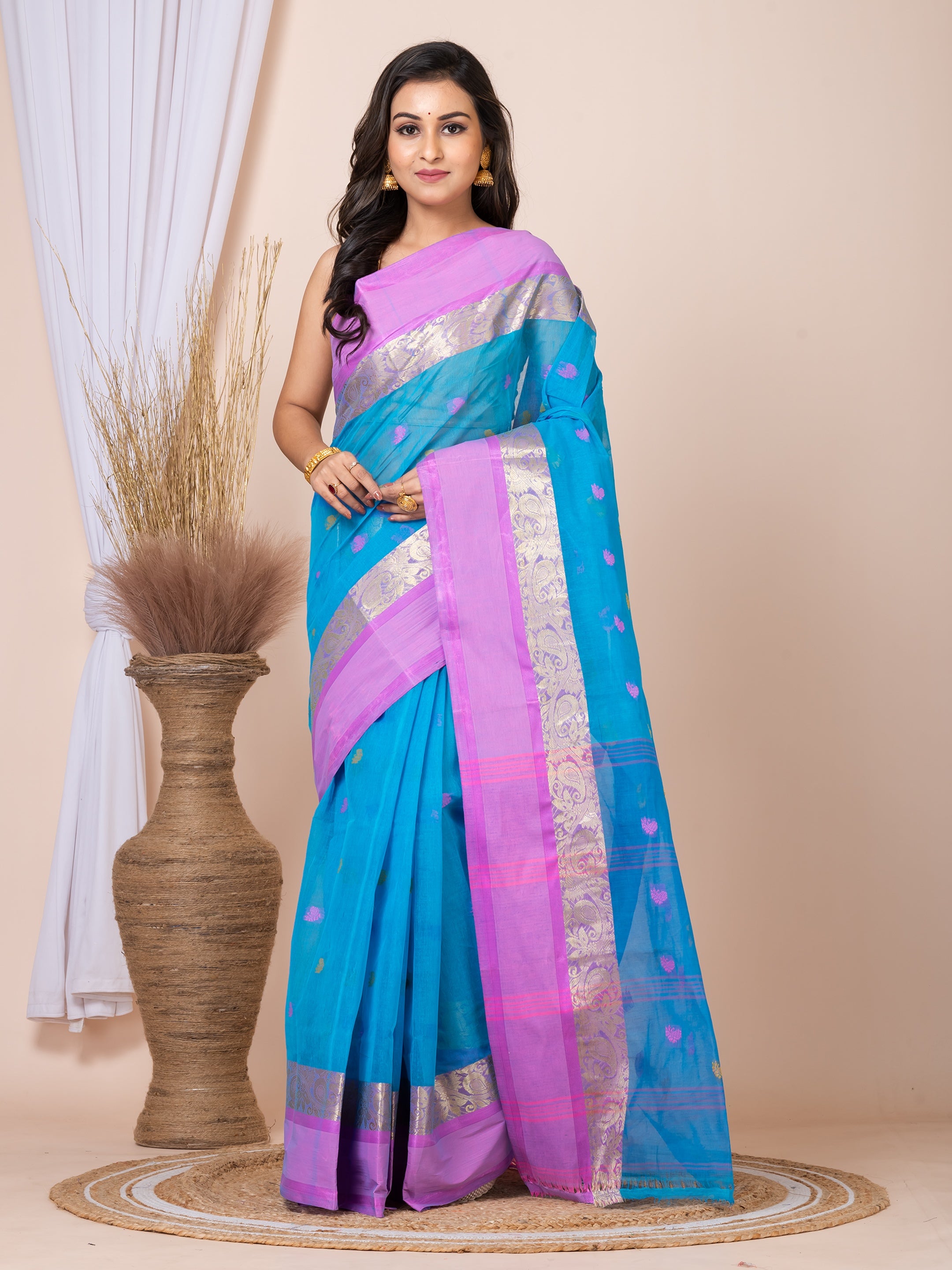 | Laa Calcutta Blue & Pink women pure cotton Taant saree |