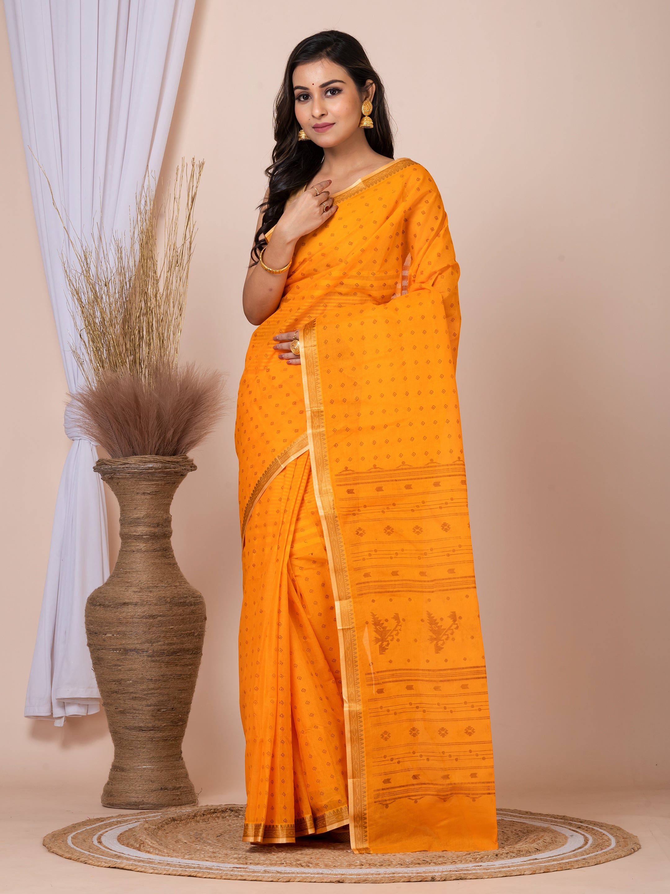 | Laa Calcutta Orange & Brown printed pure cotton taant saree |