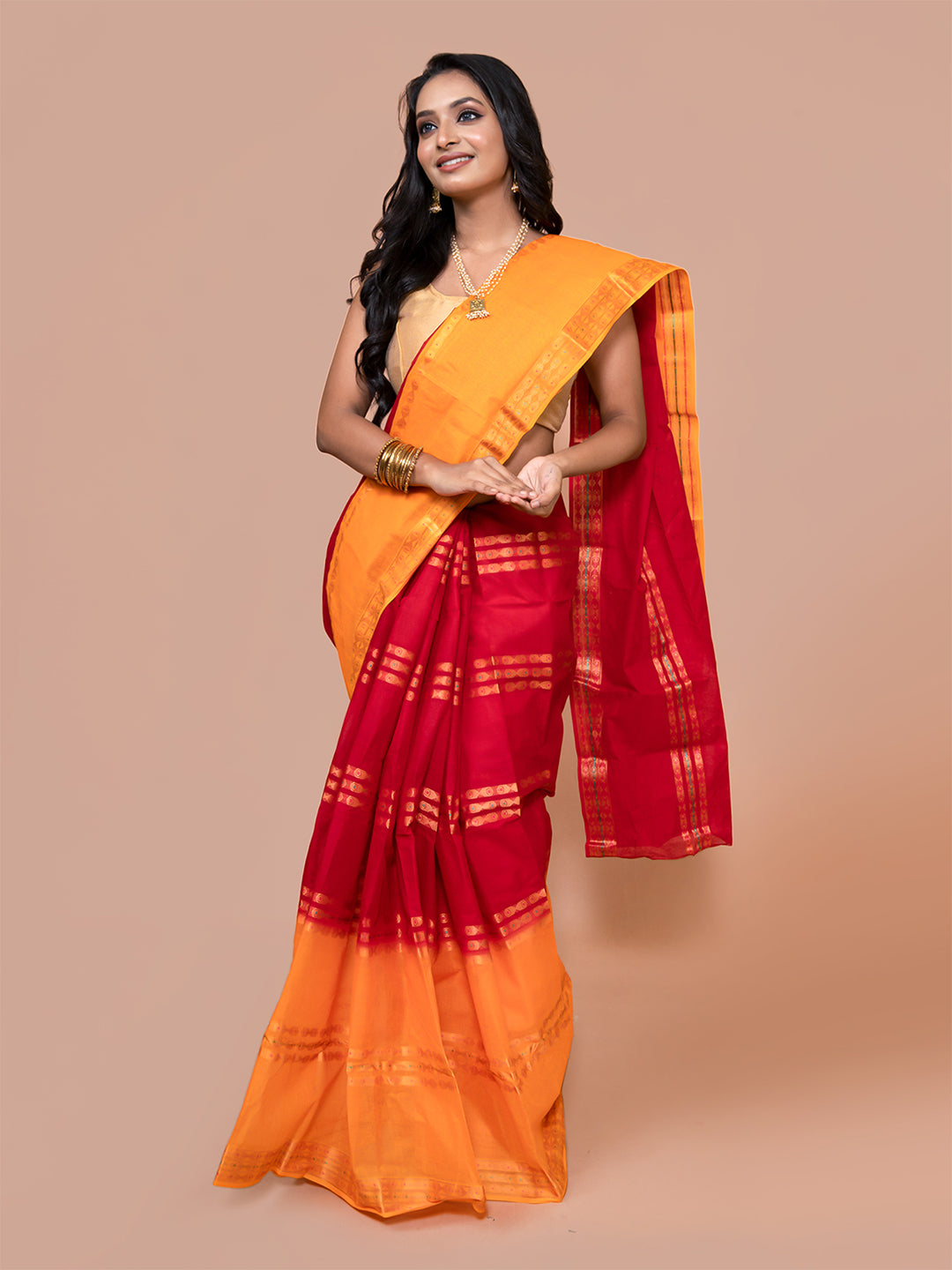 Red & Yellow pure cotton taant saree for women