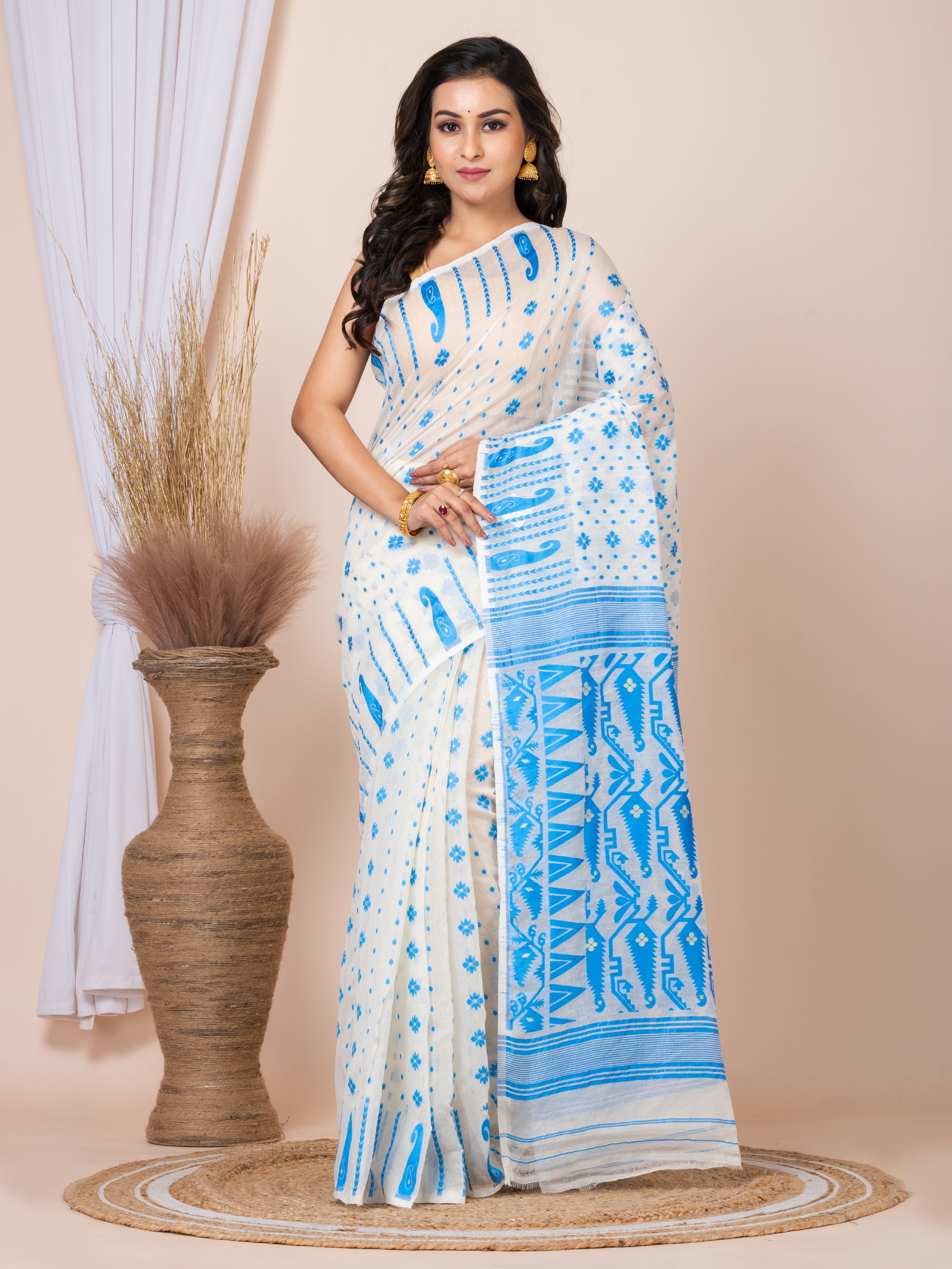 | Laa Calcutta White & Sea-Green Woven Jamdani saree |