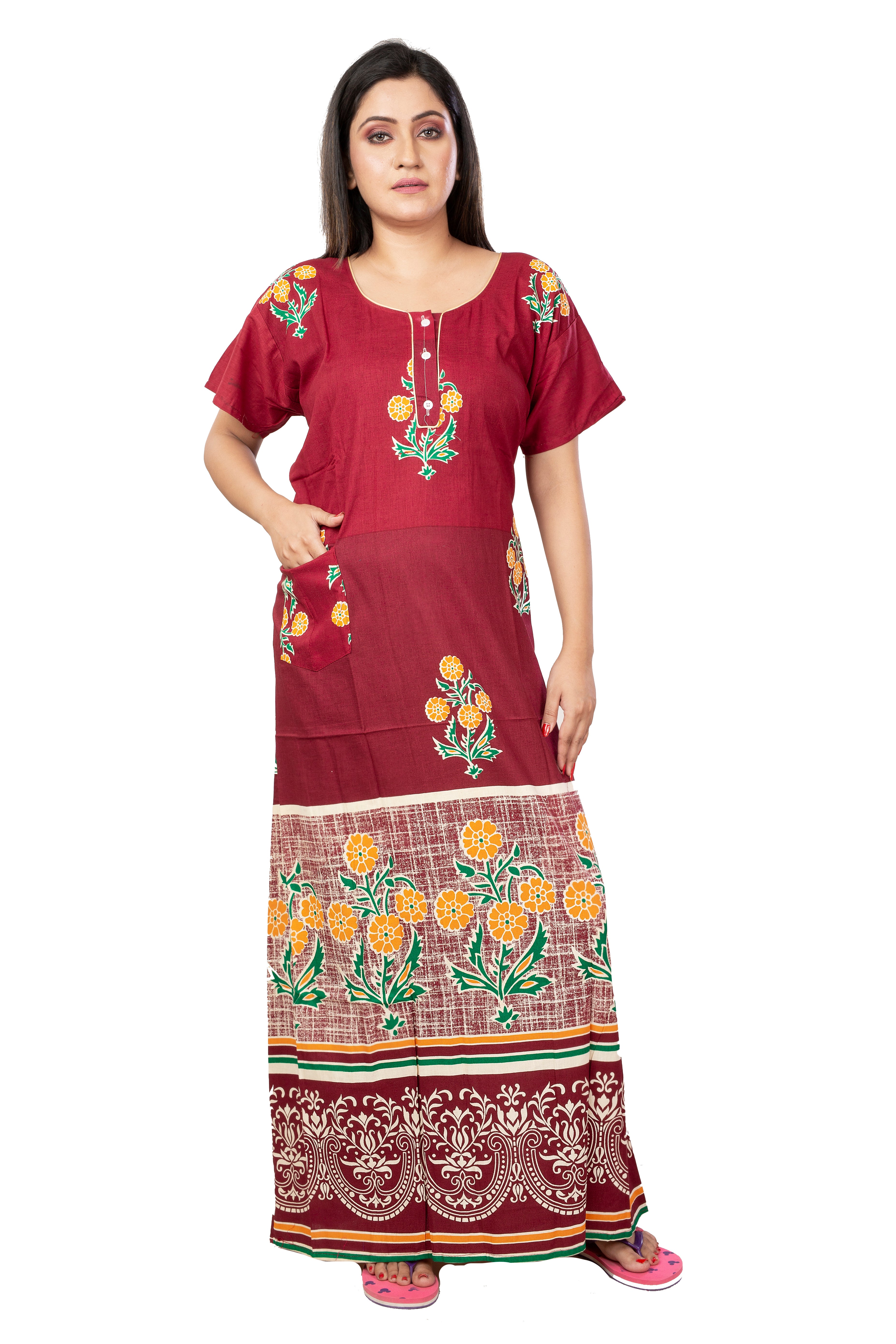 Maroon & Yellow pure cotton floral nighty