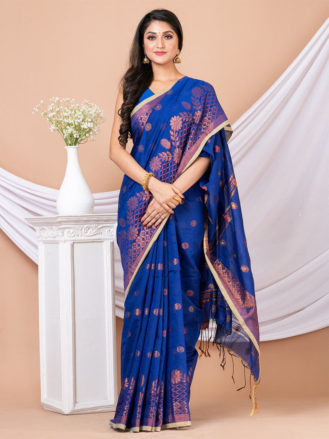 | Navy blue & Golden floral design silk cotton handloom saree |