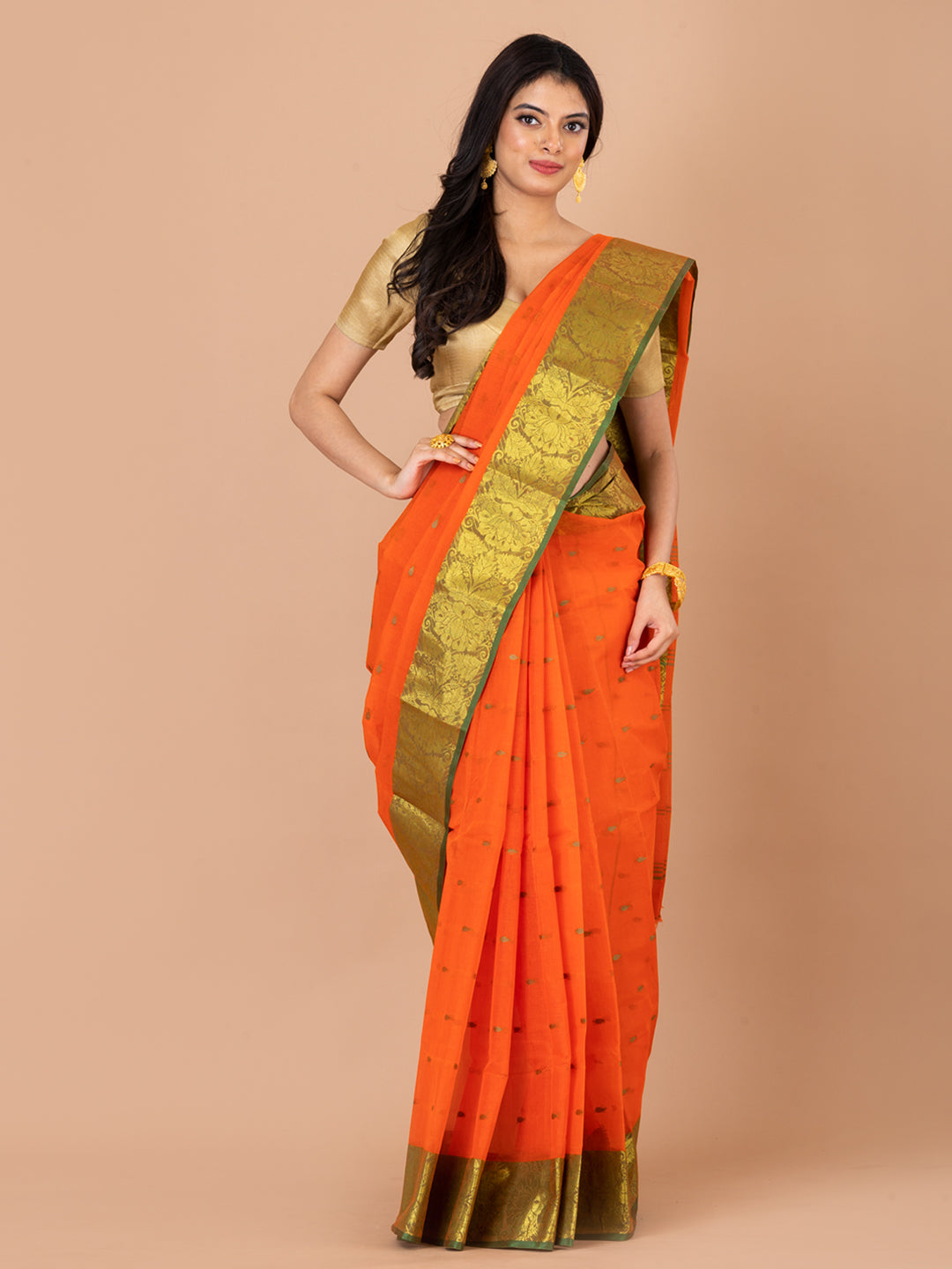 | Orange & Green pure cotton taant saree |
