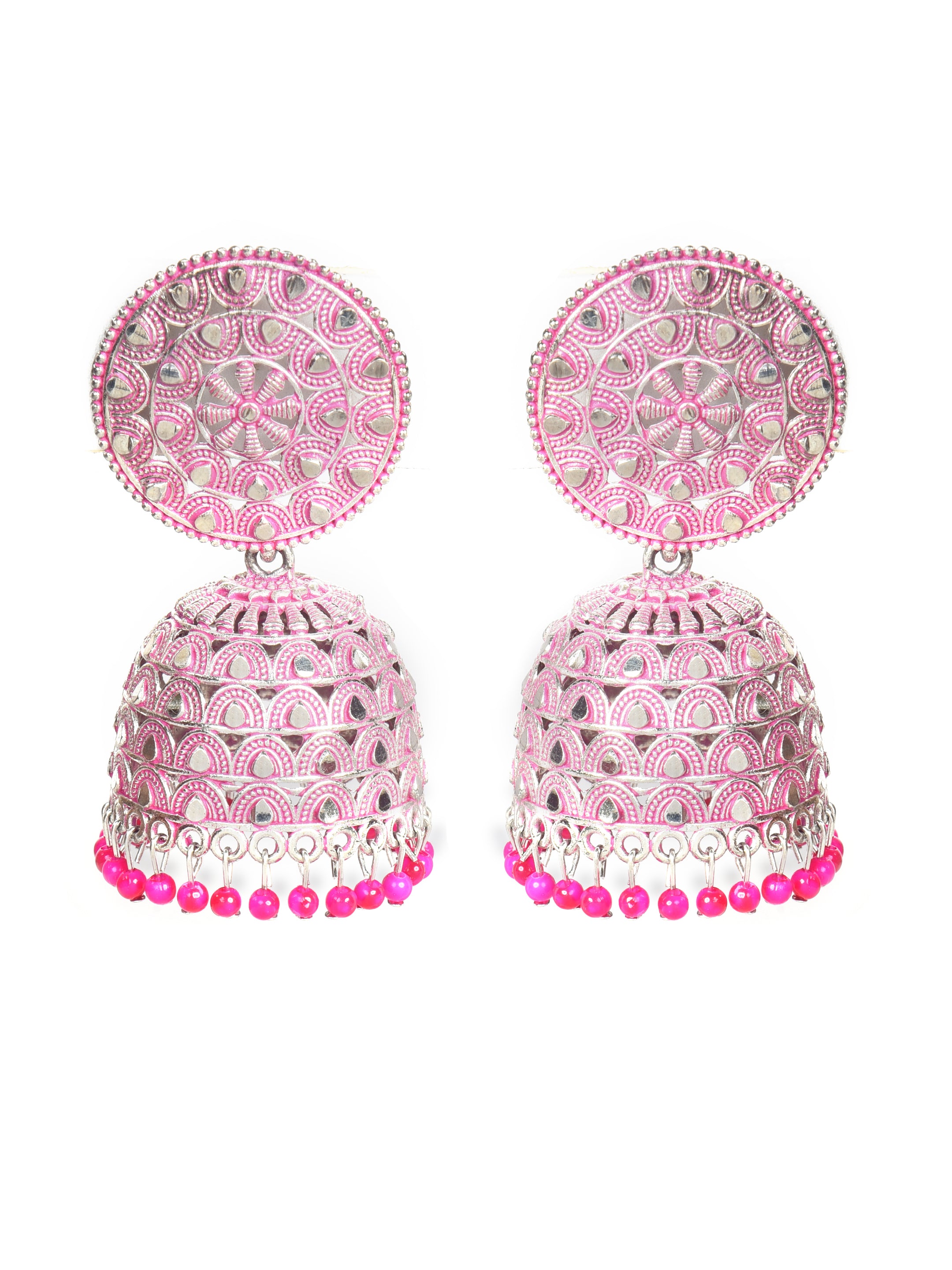 | Pink & silver-Toned Dome Shaped Jhumkas |