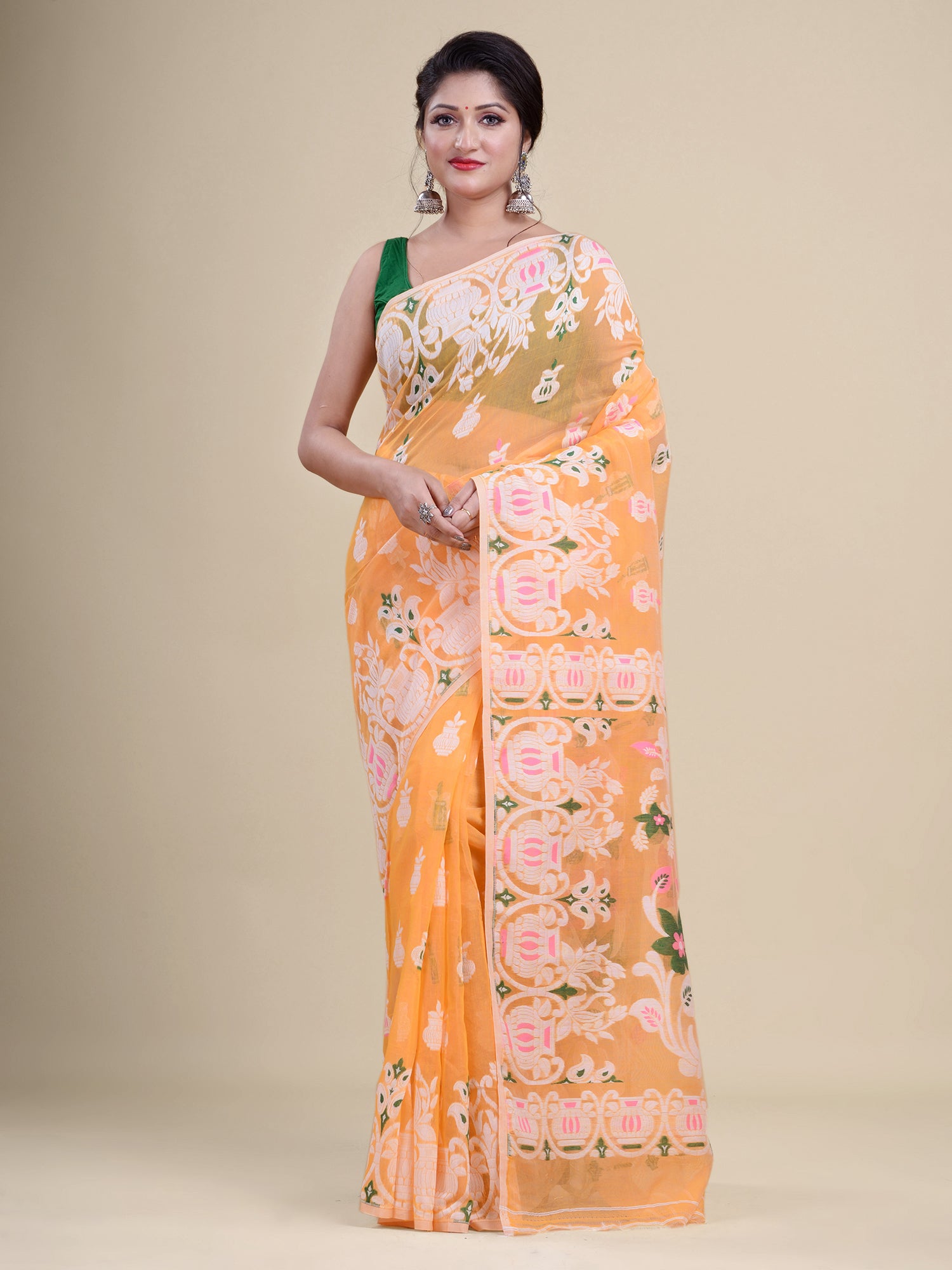 | Orange & White Cotton Jamdani Saree |