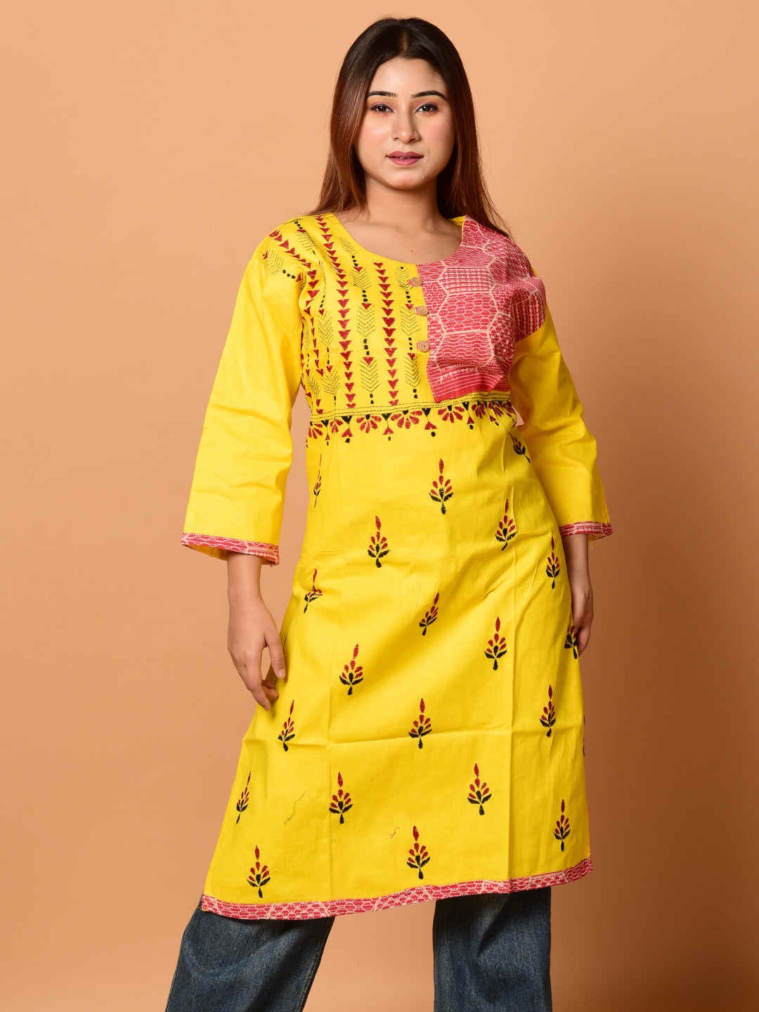 | Yellow & Multi pure cotton Kantha work Kurti |